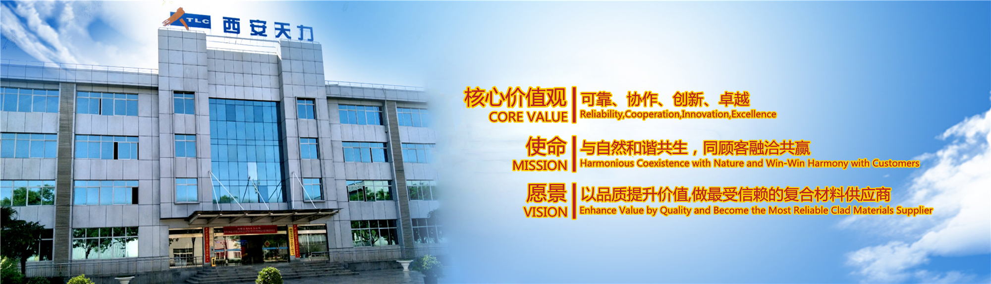 西安天力金屬復(fù)合材料股份有限公司是西北有色金屬研究院(集團)產(chǎn)業(yè)化上市公司“西部材料”控股的獨立法人公司,是專業(yè)從事層狀金屬復(fù)合材料研究及生產(chǎn)的高新技術(shù)企業(yè),成立于2003年12月25日,位于西安經(jīng)濟技術(shù)開發(fā)區(qū)涇渭工業(yè)園,注冊資本10895萬股,擁有生產(chǎn)廠房23000余平米,各類生產(chǎn)設(shè)備200余臺套及兩塊條件優(yōu)越的爆炸復(fù)合場地,形成年產(chǎn)25000噸層狀復(fù)合材料的生產(chǎn)加工能力……